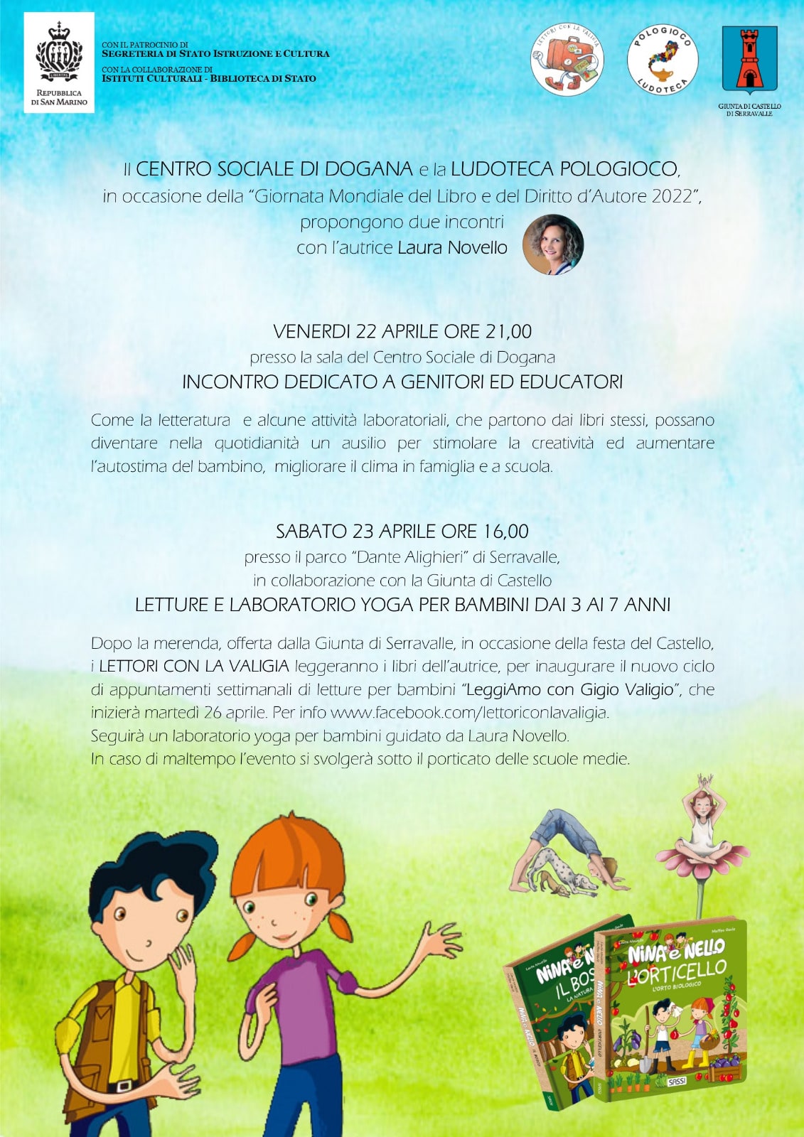 Il giorno 23 aprile alle ore 16,00: letture dei libri “Nina e Nello” e laboratorio yoga con le carte “Yoga: Storie e famiglie”